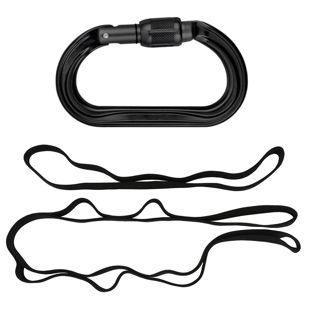 Tasiemki, karabinek, mocowanie sufitowe wraz z 4 kotwami do betonu o rozmiarze 17mm, co przekłada się na bezpieczeństwo użytkowania całego zestawu.