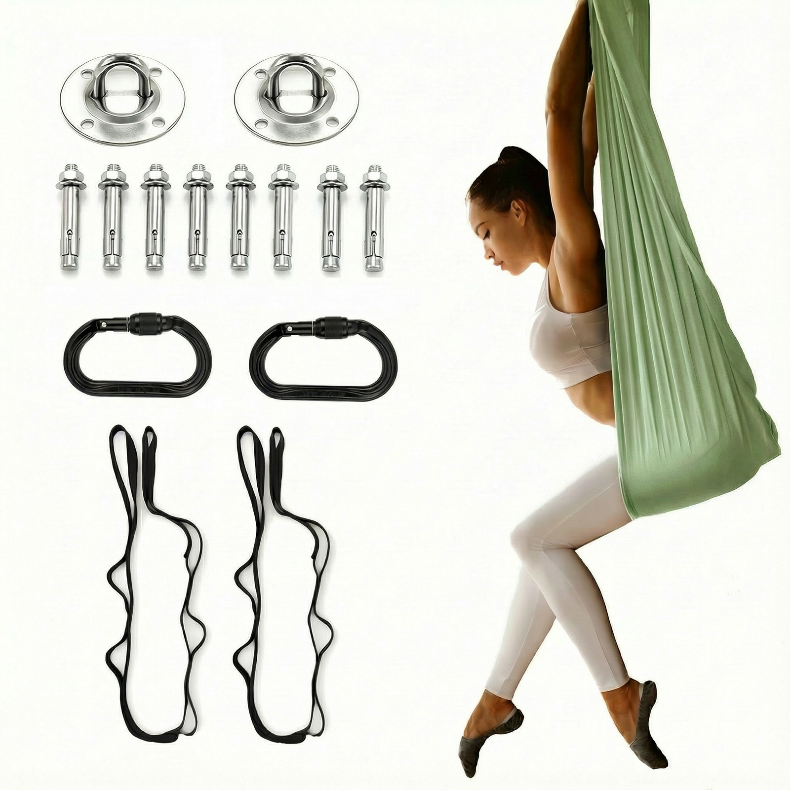 Montaż hamaka uzależniony jest od materiału, z jakiego wykonany jest sufit. Zalecamy wcześniejszą konsultację z ekspertem. Do zestawu dołączone są niezbędne elementy, które pozwolą Ci prawidłowo zamocować hamak na stabilnym suficie lub belce / drzewie. Szarfę montujemy bezpośrednio karabinkami do haków montażowych. Odległość między hakami dla Aerial Jogi powinna mieścić się w zakresie: 40 – 55 cm.