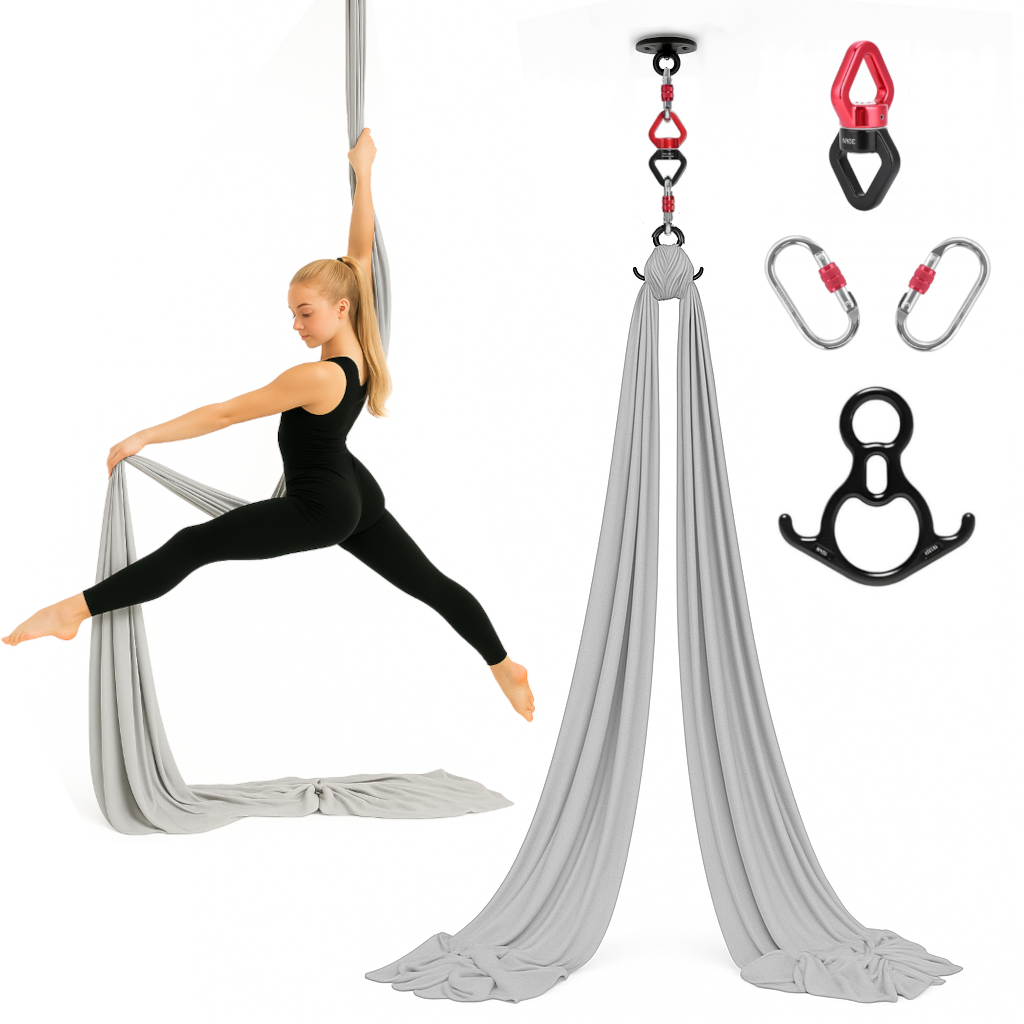 Nasze szarfy to idealny wybór zarówno dla amatorów jak i profesjonalnych akrobatów. Wykonane z wysokiej jakości materiałów, które zapewnią Ci wyjątkową przyczepność oraz płynność ruchu. Dzięki naszej szarfie aerial silk wykonywanie trudnych do tej pory akrobacji stanie się przyjemniejsze i łatwiejsze. Zestaw posiada niezbędne elementy do stworzenia profesjonalnego układu do akrobacji.